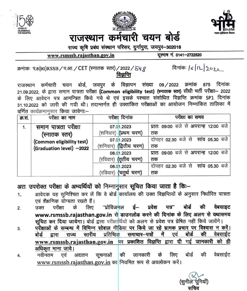 RAJASTHAN CET EXAM DATE 2022 (Graduate Level) राजस्थान समान पात्रता परीक्षा कार्यक्रम 2022 जारी ऑनलाइन फॉर्म : 22-09-2022 से 21-10-2022 31.10.2022। संशोधित कुल
