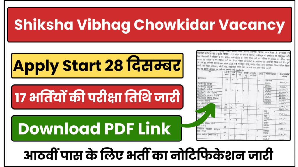 Shiksha Vibhag Chowkidar Vacancy 2024 शिक्षा विभाग में चौकीदार के पदों के लिए 8वीं पास के लिए भर्ती निकली, आवेदन