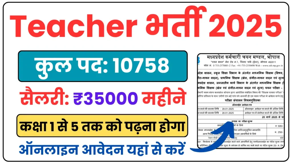 MPESB Teacher Recruitment 2025 शिक्षक भर्ती का 10758 पदों पर नोटिफिकेशन जारी, ऑनलाइन आवेदन यहां से करें: मध्य प्रदेश शिक्षक