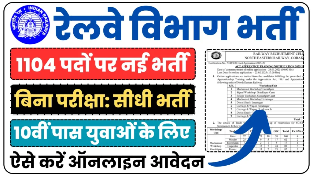 Railway NER Recruitment 2025 उत्तर पूर्वी रेलवे में 1104 पदों पर निकली भर्ती, योग्यता 10वीं पास आवेदन यहां से करें:
