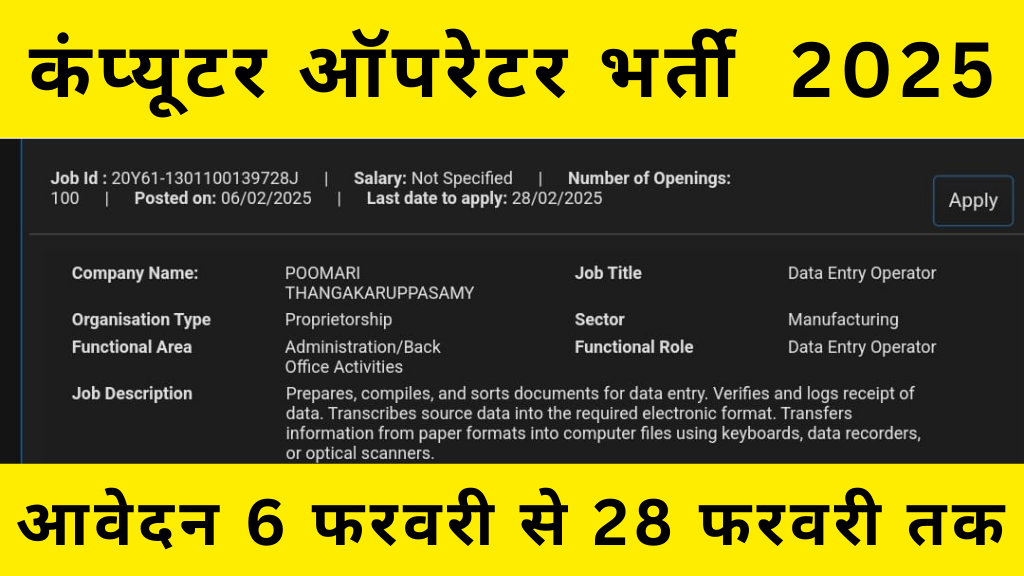 Computer Operator Recruitment कंप्यूटर ऑपरेटर भर्ती के लिए आवेदन फॉर्म भरने शुरू डाटा एंट्री ऑपरेटर के पदों पर भर्ती का