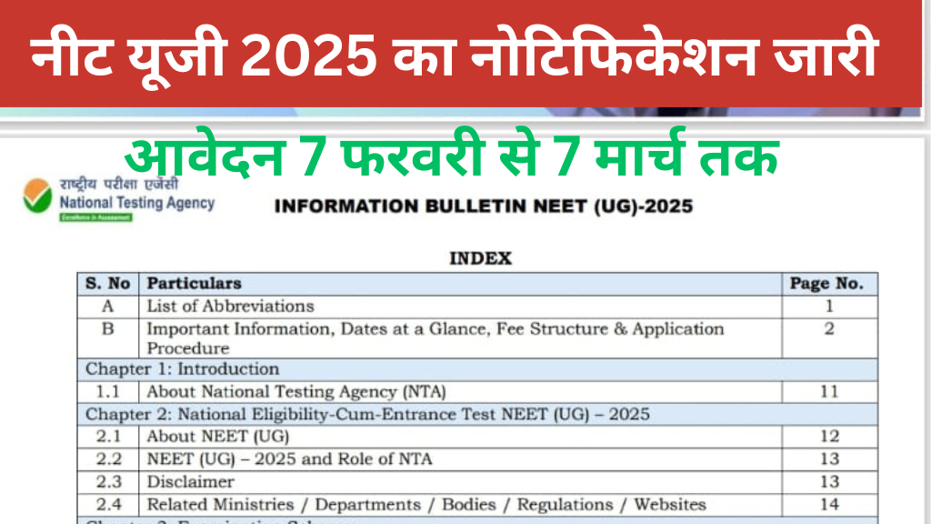 NEET UG 2025 नीट यूजी 2025 के लिए अधिकारी नोटिफिकेशन जारी कर दिया गया है जिसके अनुसार इसके ऑनलाइन आवेदन