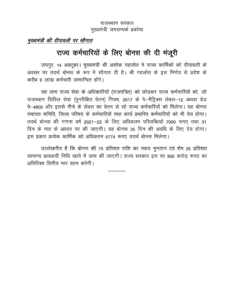 राजस्थान सरकार के वित विभाग के द्वारा आज दिनांक 14.10.2022को राज्य के कर्मचारियों के लिए दिवाली का बोनस देने की