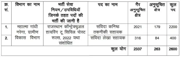 Rajasthan JTA Account Assistant Vacancy: राजस्थान कनिष्ठ तकनीकी सहायक और लेखा सहायक के 2600 पदों पर भर्ती के लिए आधिकारिक विज्ञापन जारी कर दिया गया है इसमें संविदा कनिष्ठ तकनीकी सहायक के 2200 पद तथा संविदा लेखा सहायक के 400 पद निर्धारित किया गया हैं. इस भर्ती में गैर अनुसूचित क्षेत्र के लिए 2337 पद तथा अनुसूचित क्षेत्र के 263 पद निर्धारित किया गया हैं इस भर्ती के लिए महिला एवं पुरुष दोनों अभ्यर्थी आवेदन कर सकते हैं इस भर्ती के लिए ऑनलाइन आवेदन फॉर्म भरा जाएगा