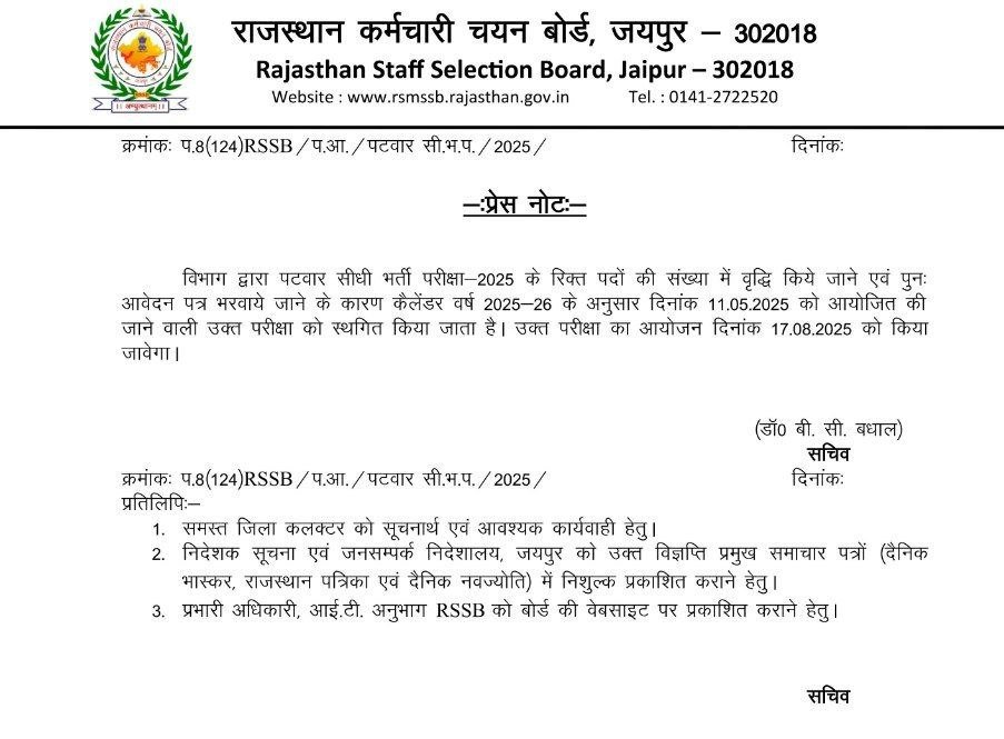 राजस्थान पटवारी भर्ती 2025 की नई परीक्षा तिथि जारी कर दी गई है जिसका आधिकारिक नोटिस जारी कर दिया गया है राजस्थान पटवारी भर्ती की परीक्षा 17 अगस्त 2025 को आयोजित करवाई जा रही है इसके अलावा एडमिट कार्ड परीक्षा तिथि से 7 दिन पहले राजस्थान कर्मचारी चयन बोर्ड की आधिकारिक वेबसाइट पर जारी कर दिए जाएंगे