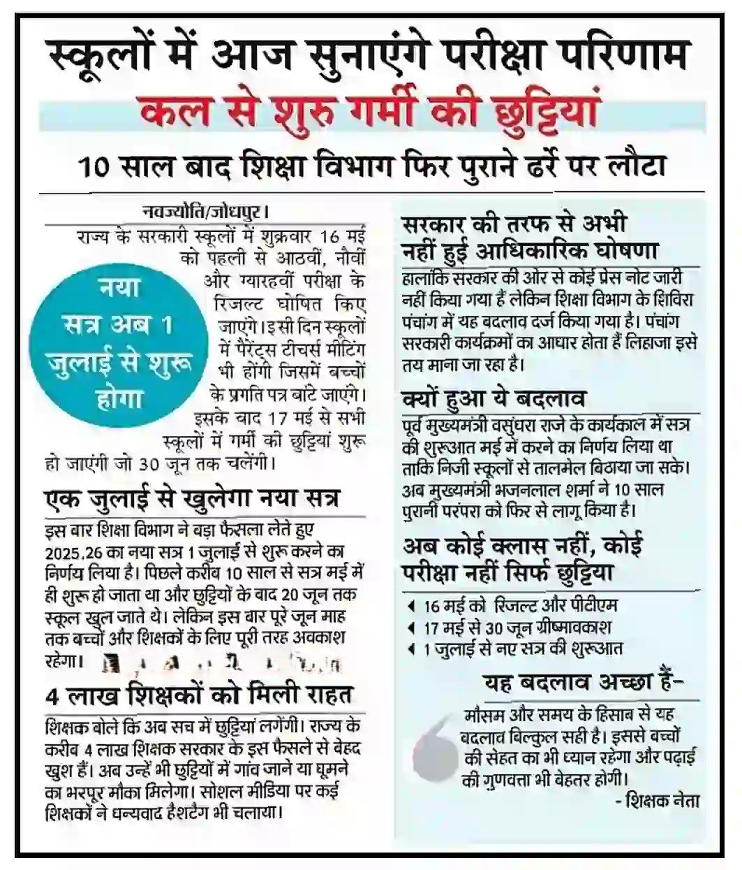 Rajasthan School Summer Vacation 2025 राजस्थान की सभी स्कूलों में गर्मियों की छुट्टियां घोषित, यहां से देखें: राजस्थान की सभी स्कूलों में गर्मियों की छुट्टी 17 मई से स्टार्ट हो रही है राजस्थान सरकार ने बढ़ती हुई गर्मी के तापमान को देखते हुए प्रदेश के सभी स्कूलों की छुट्टी 17 मई 2025 से शुरू की गई है अभी-अभी ट्विटर पर न्यूज़ आई है कि प्रदेश के स्कूलों के 17 मई से ग्रीष्मकालीन अवकाश स्कूल स्तर परीक्षा का रिजल्ट 16 मई तक होगा घोषित